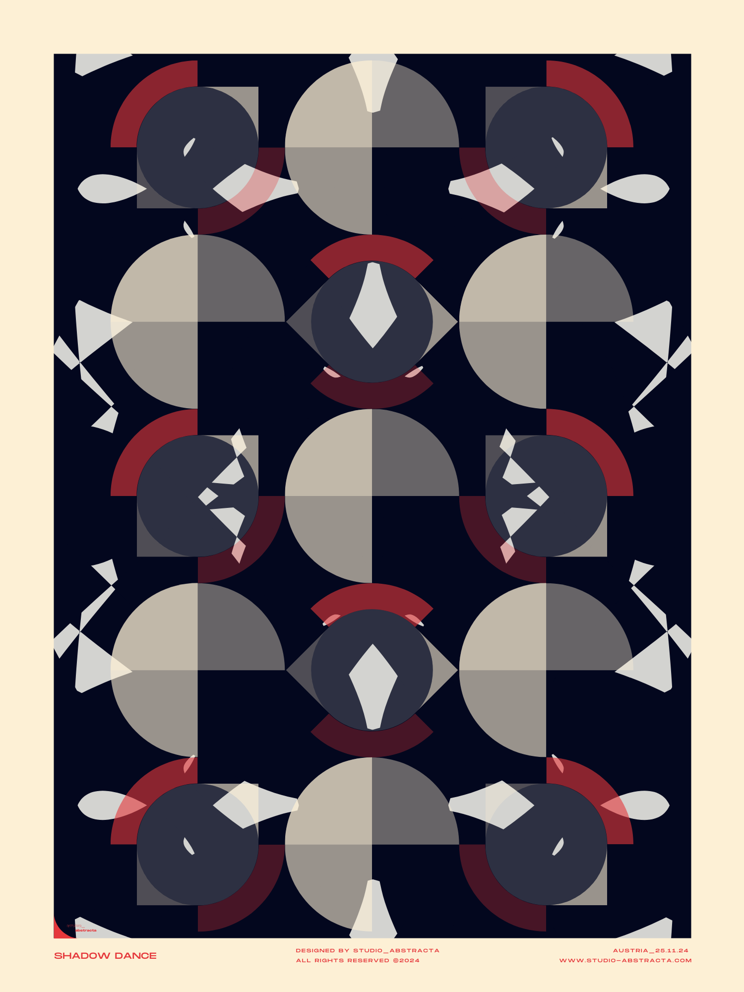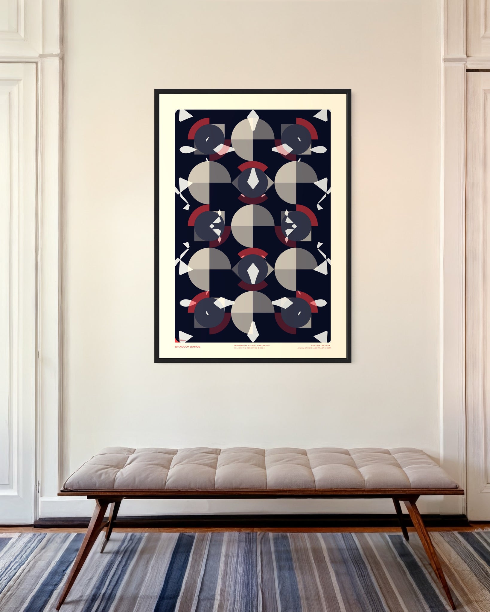 Shadow Dance ist ein Werk, das sich durch seine subtile, aber eindrucksvolle Dynamik auszeichnet. Die Komposition zeigt eine Reihe von geometrischen Formen, die miteinander in einem harmonischen Tanz der Kontraste spielen. Die dominierenden Grautöne und tiefen Blautöne vermitteln eine gewisse Ernsthaftigkeit, die durch die akzentuierenden roten und weißen Elemente aufgelockert wird. Es entsteht ein Gefühl von Spannung und zugleich Ruhe, als ob die Formen in einem endlosen Tanz miteinander in Interaktion treten.