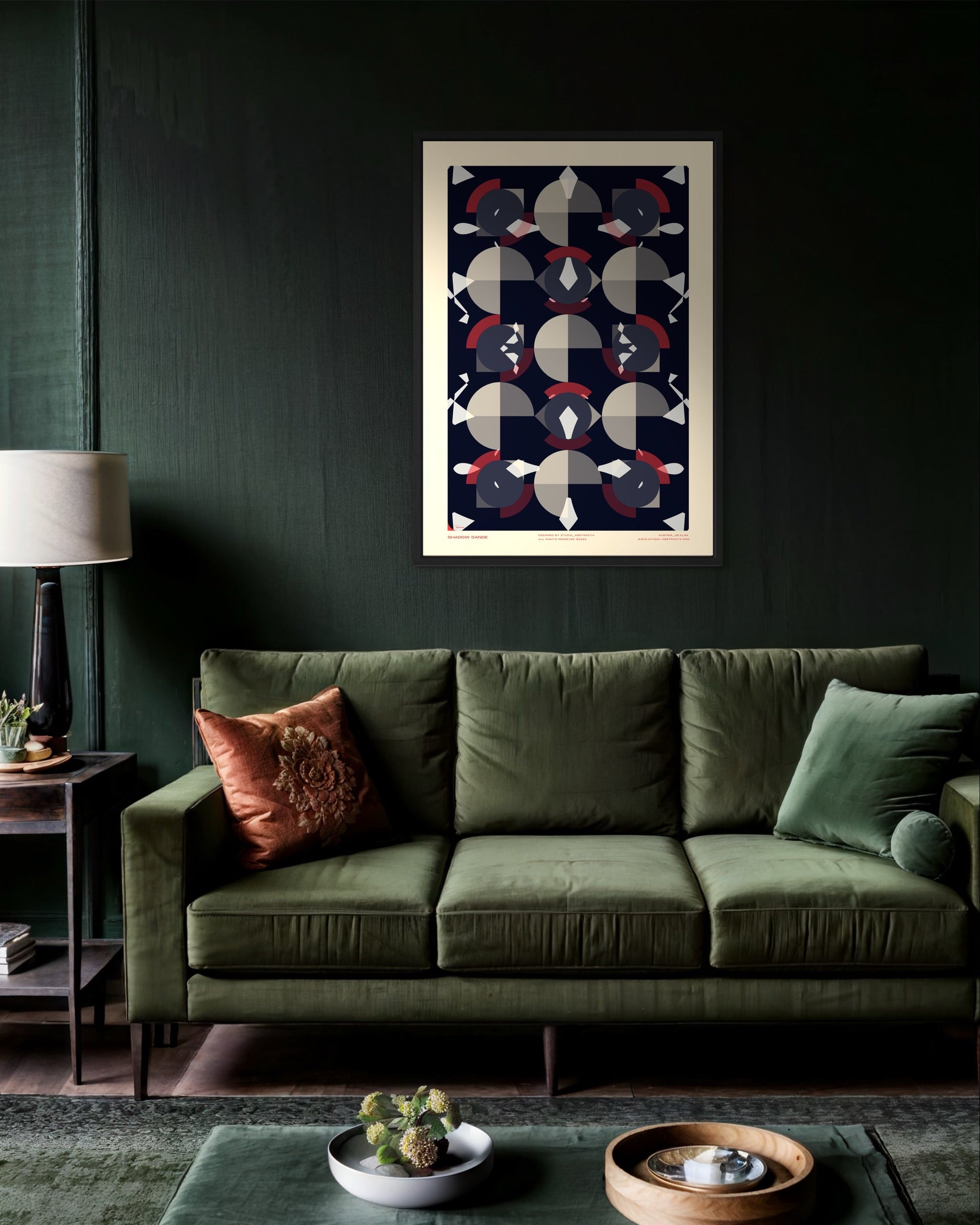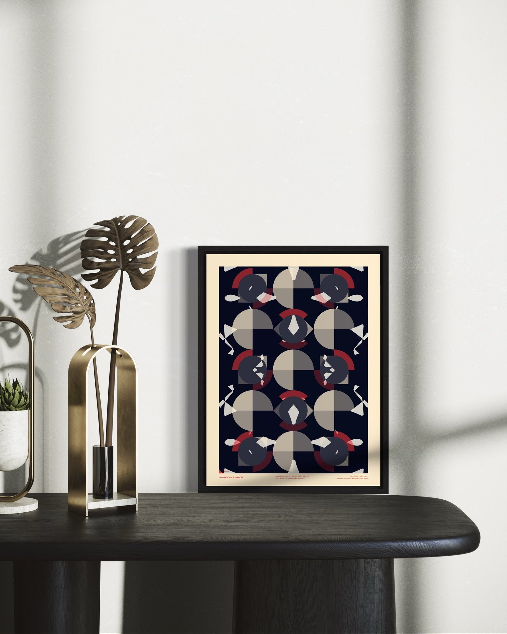 Shadow Dance is a piece that stands out for its subtle yet striking dynamics. The composition features a series of geometric shapes playing in a harmonious dance of contrasts. The dominant greys and deep blues convey a sense of seriousness, which is offset by the accentuating red and white elements. There is a sense of tension and calm simultaneously, as if the forms are engaged in an endless dance of interaction with each other.
