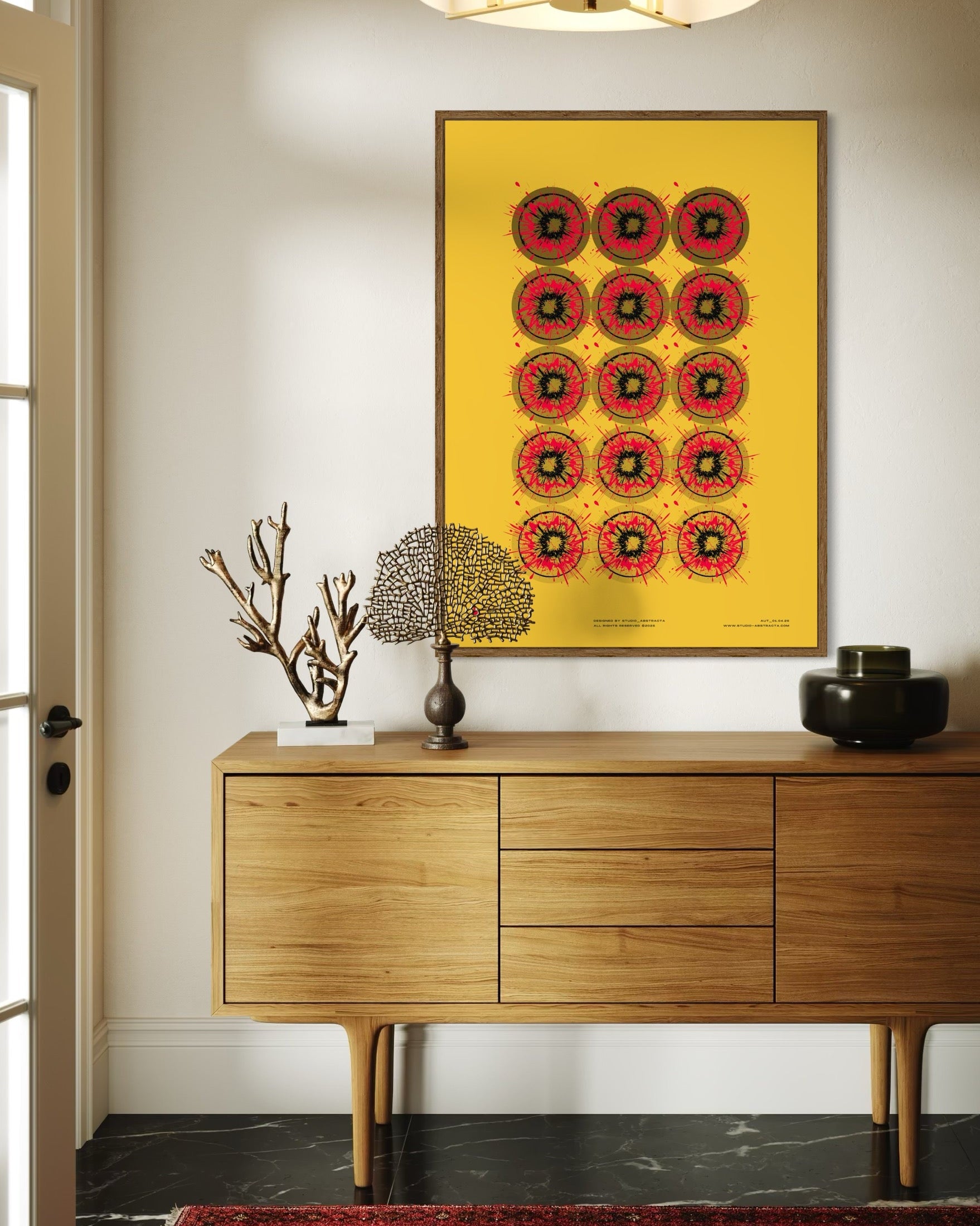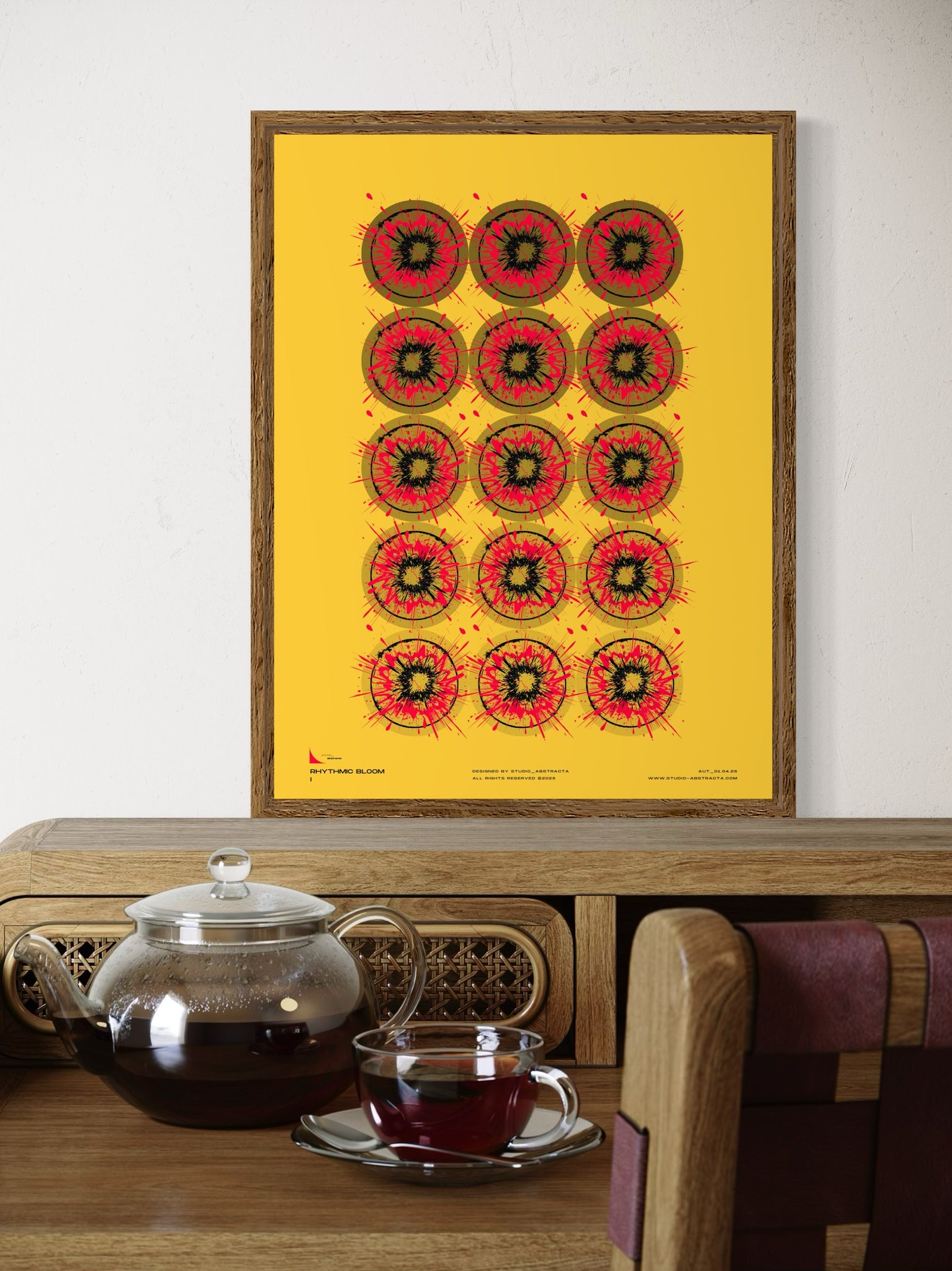 Rhythmic Bloom I expresses the energy of repetition and movement through a vibrant, structured pattern. The bold colors and repeated shapes create a sense of dynamism and growth. Each element seems to merge in a harmonious rhythm, evoking the explosion of nature and its cyclical processes.