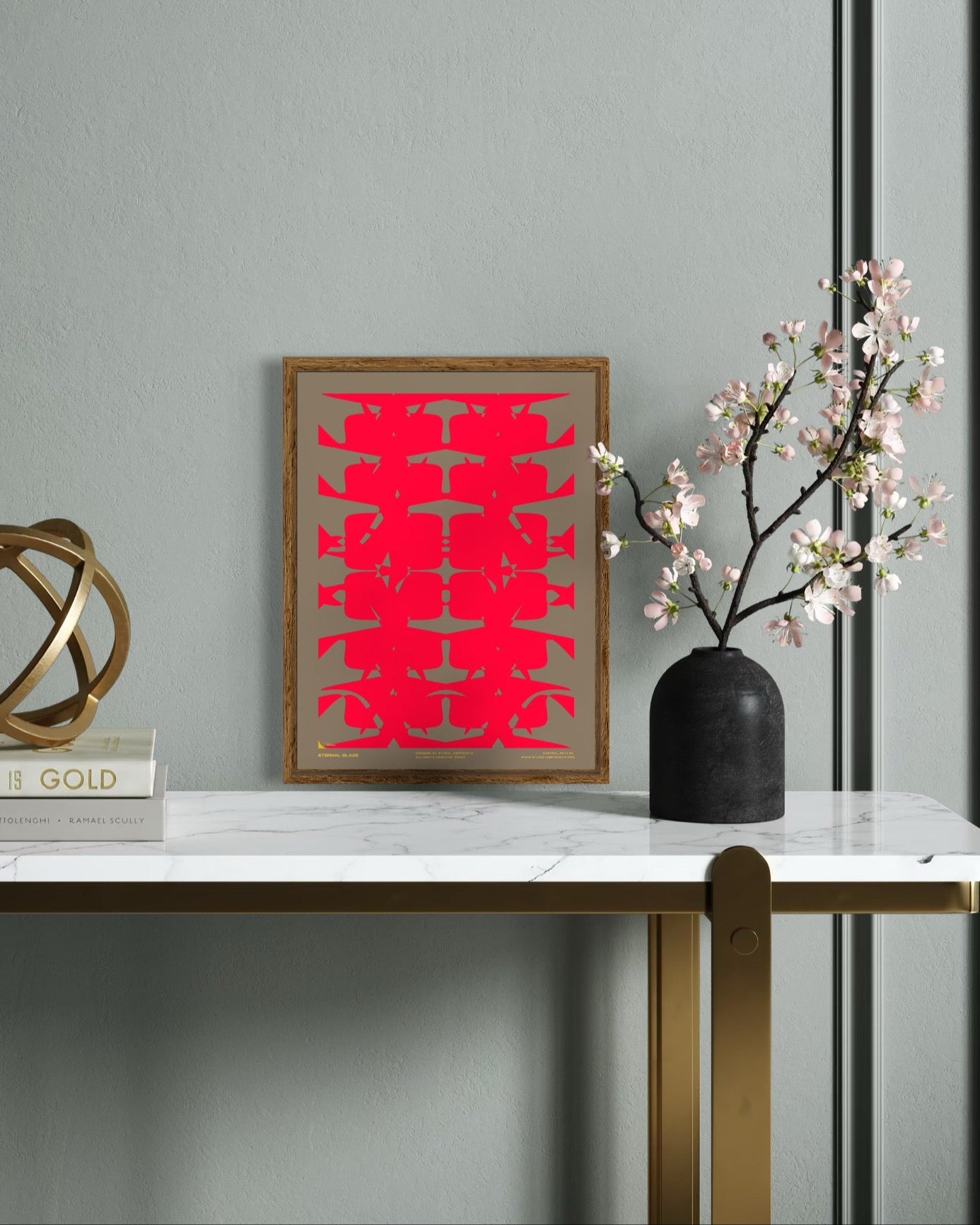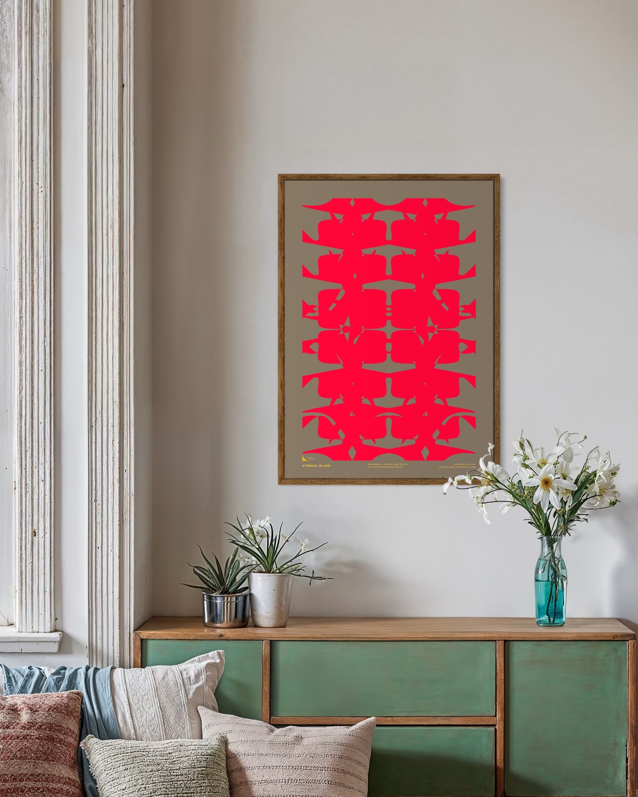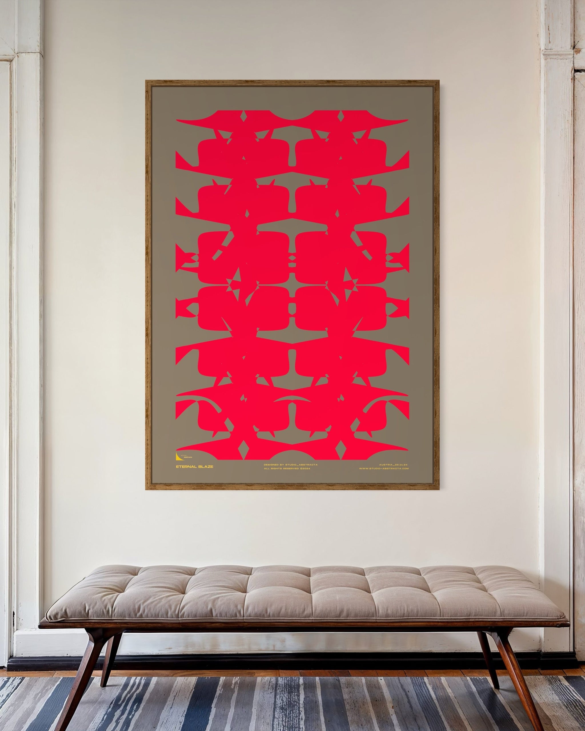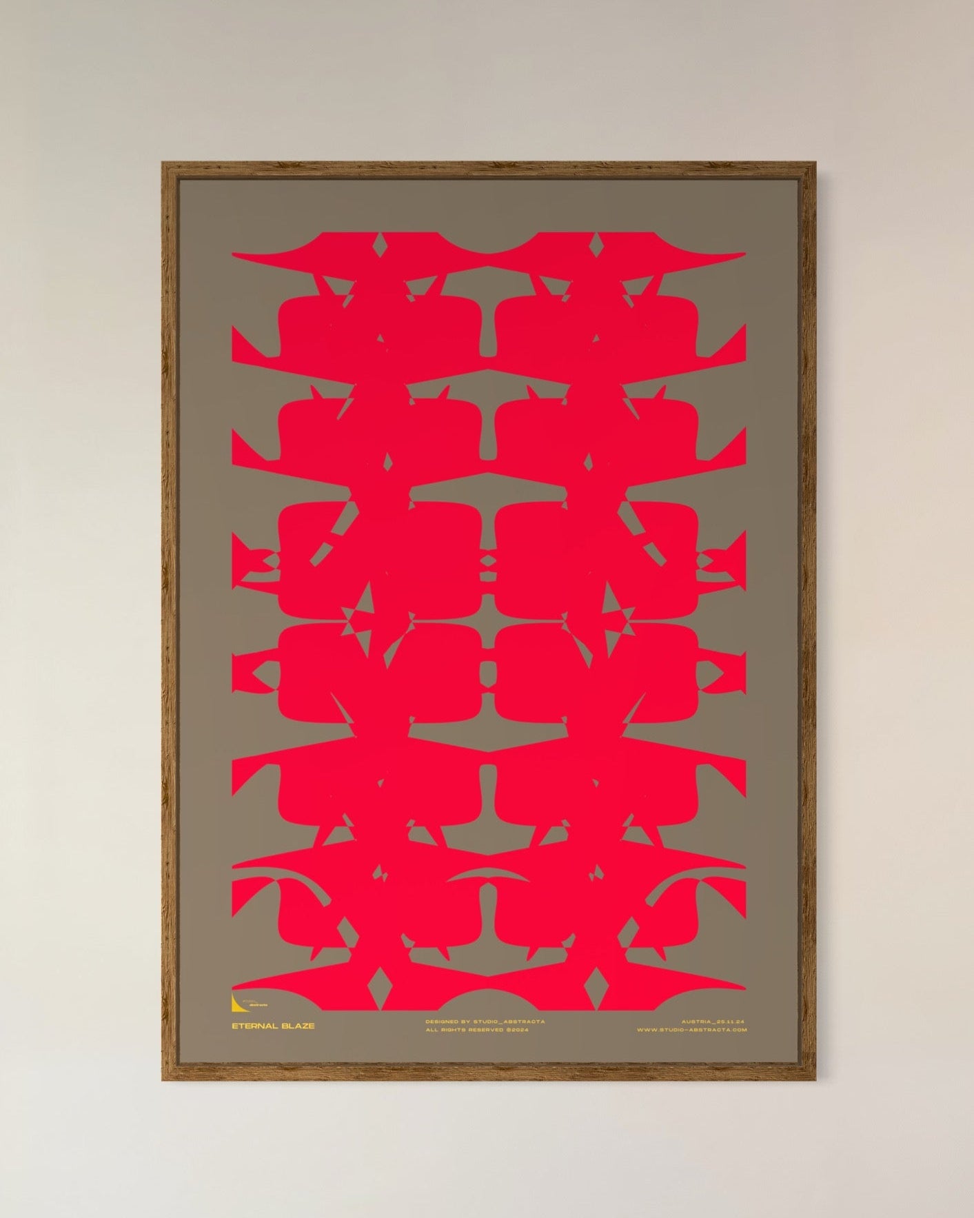 ETERNAL BLAZE entfacht eine visuelle Flamme aus lebendigem Rot, Orange und sanften Gelbtönen. Die dynamische Anordnung der Formen und die klare Farbtrennung schaffen eine kraftvolle, aber gleichzeitig faszinierende Komposition.