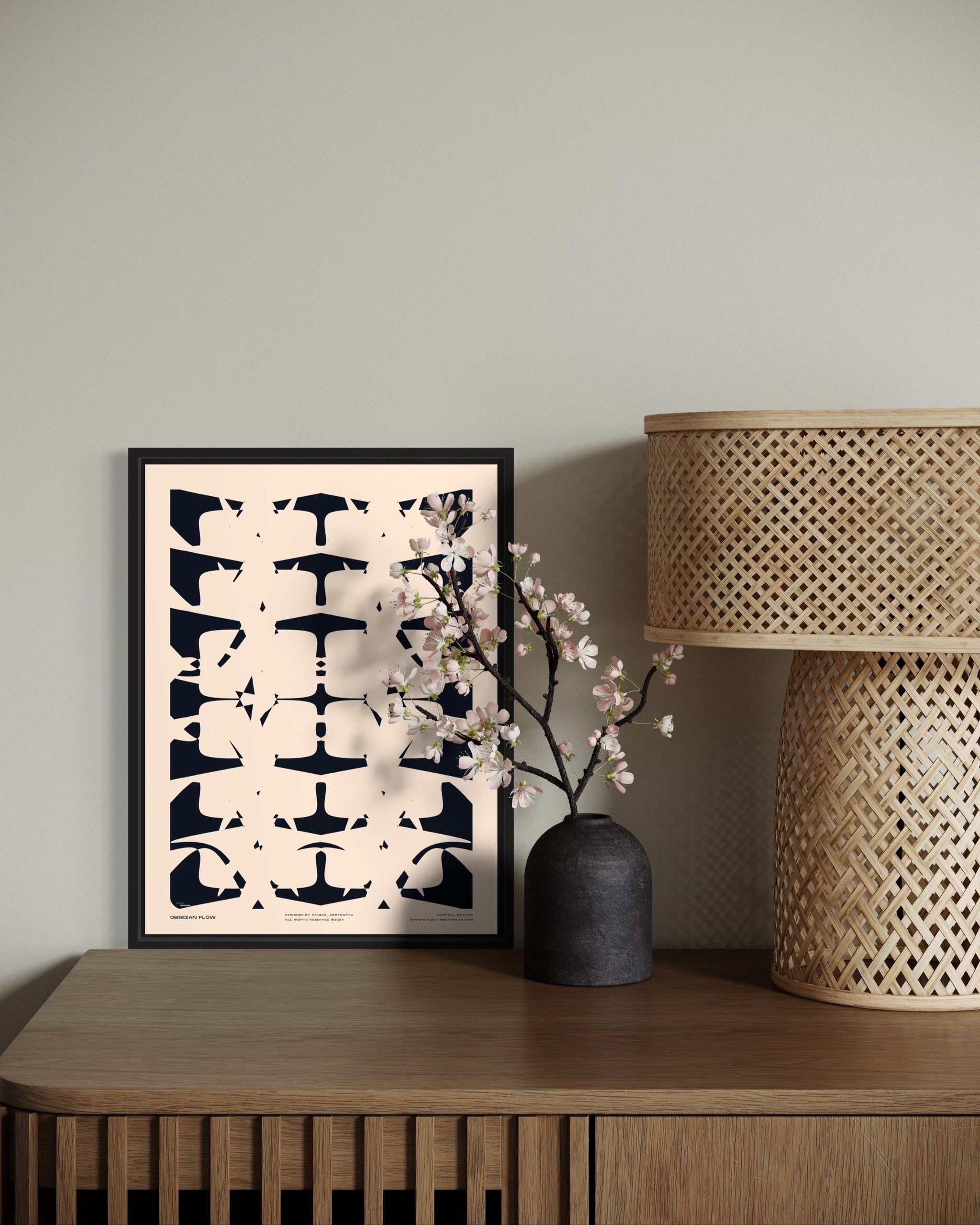 Obsidian Flow plays with contrasts of deep blues and earthy tones. The abstract forms made of black and gray elements are interwoven with light, transparent blues, creating an impression of fluid movement. The geometric structures seem to interact, morphing and blending together, giving the piece both a dynamic and calming effect.