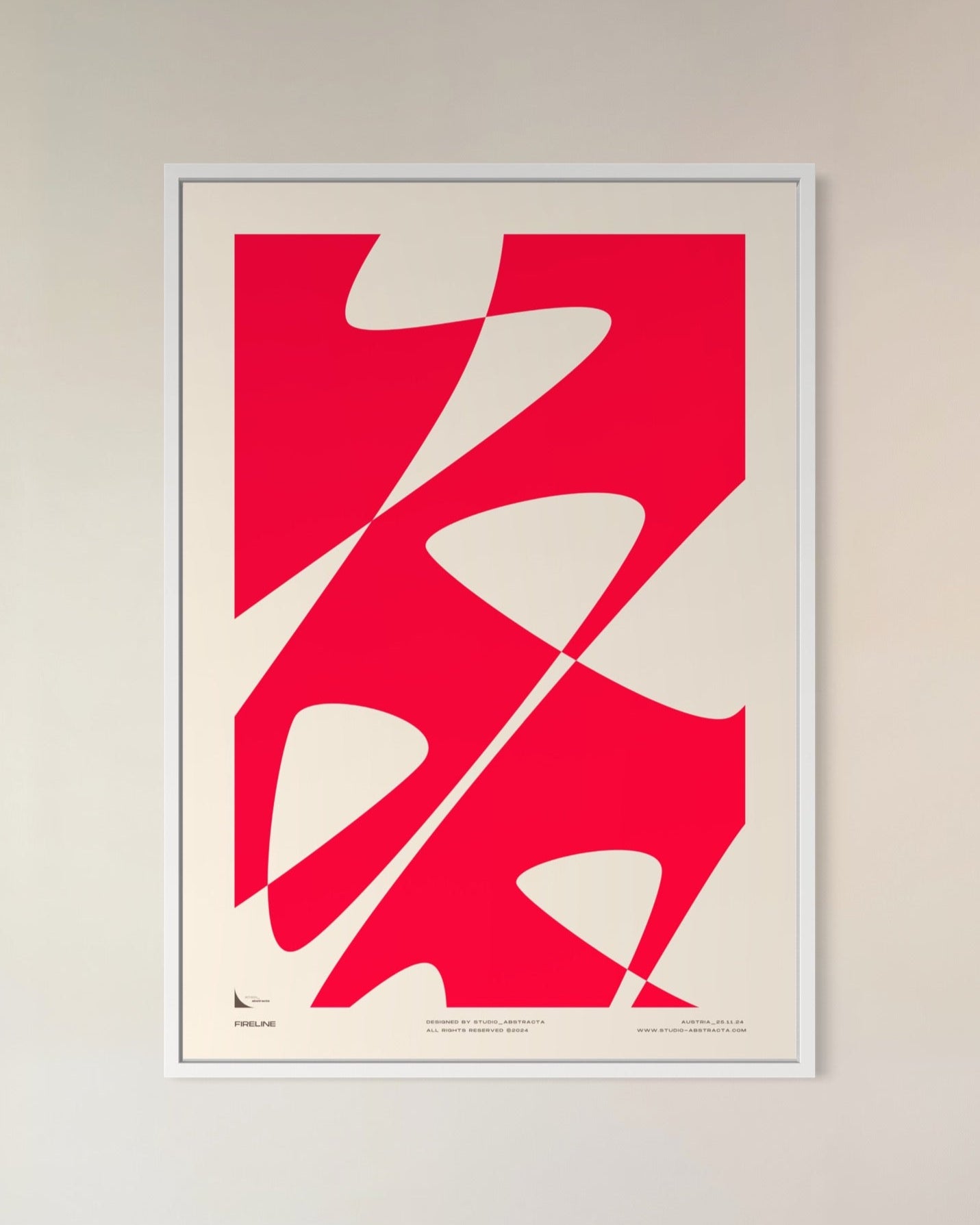 FIRELINE ignites a visual flame, channeled through bold reds and grays in clear geometric lines and shapes. The dynamic energy of the piece is amplified by the precise alignment of elements, creating a tension between intensity and calm.