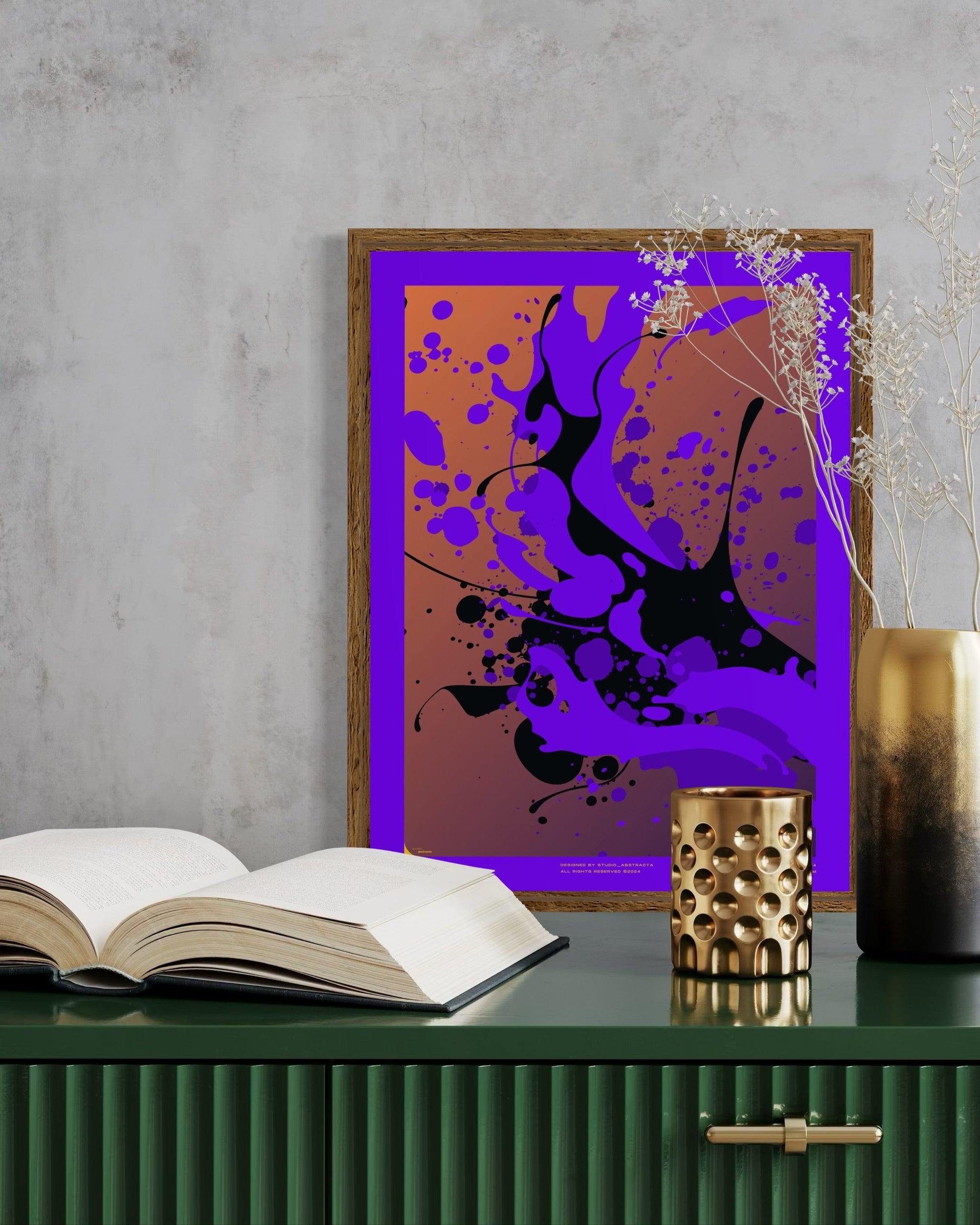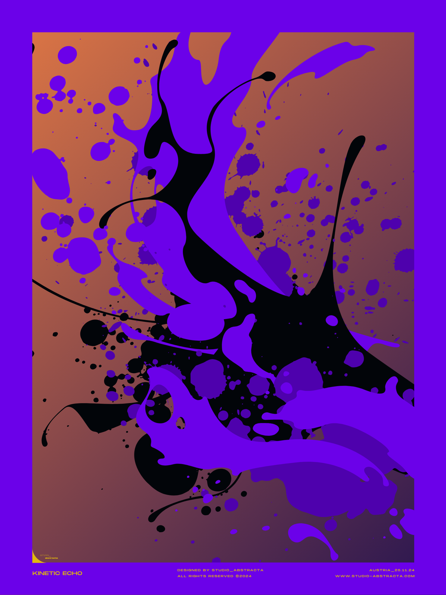 KINETIC ECHO unfolds a powerful visual narrative full of movement and energy. The vibrant colors in red and purple, combined with dynamic shapes and bold splashes of color, make the artwork feel as though it’s vibrating. The flowing lines and geometric elements create a sense of oscillations and impulses traveling through the space.