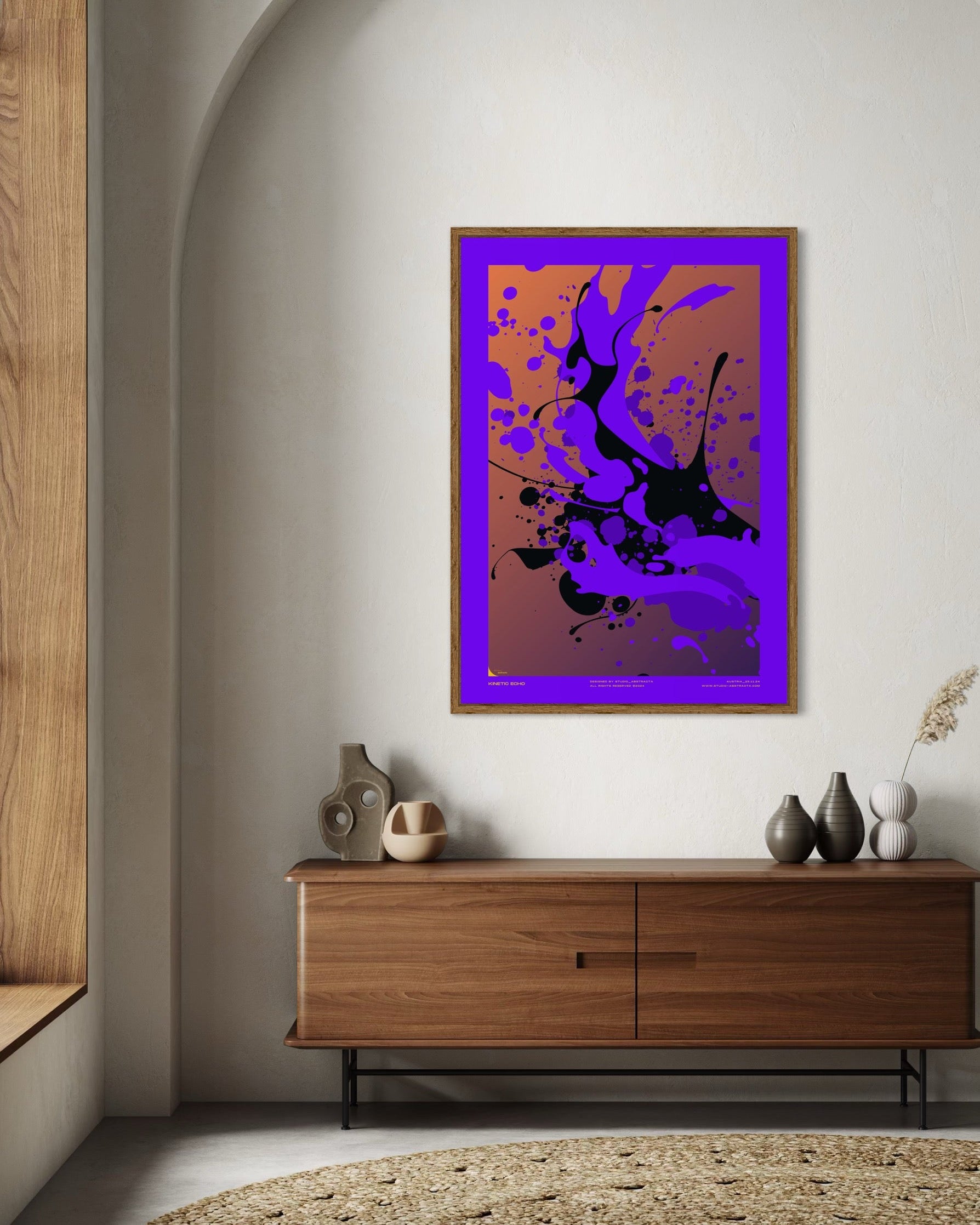 KINETIC ECHO entfaltet eine kraftvolle visuelle Erzählung voller Bewegung und Energie. Die leuchtenden Farben in Rot und Lila, zusammen mit dynamischen Formen und kräftigen Farbspritzern, lassen das Kunstwerk förmlich vibrieren. Die fließenden Linien und geometrischen Elemente erzeugen das Gefühl von Schwingungen und Impulsen, die sich durch den Raum bewegen.