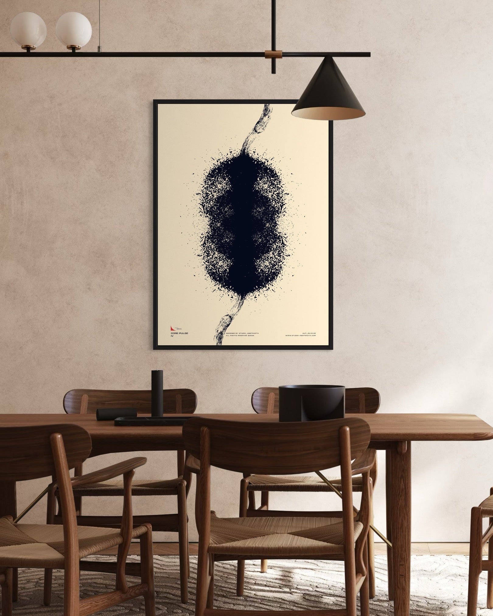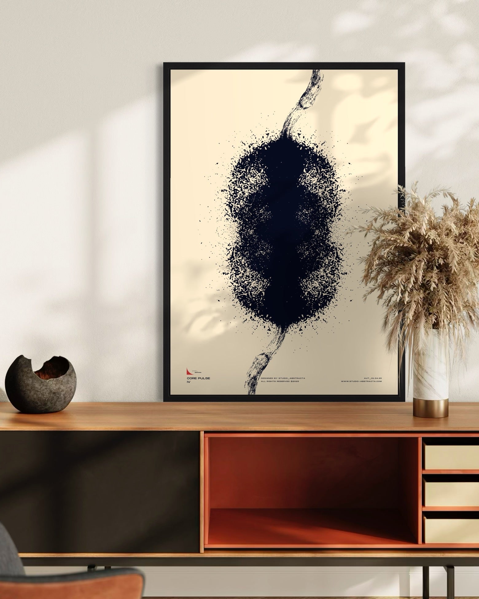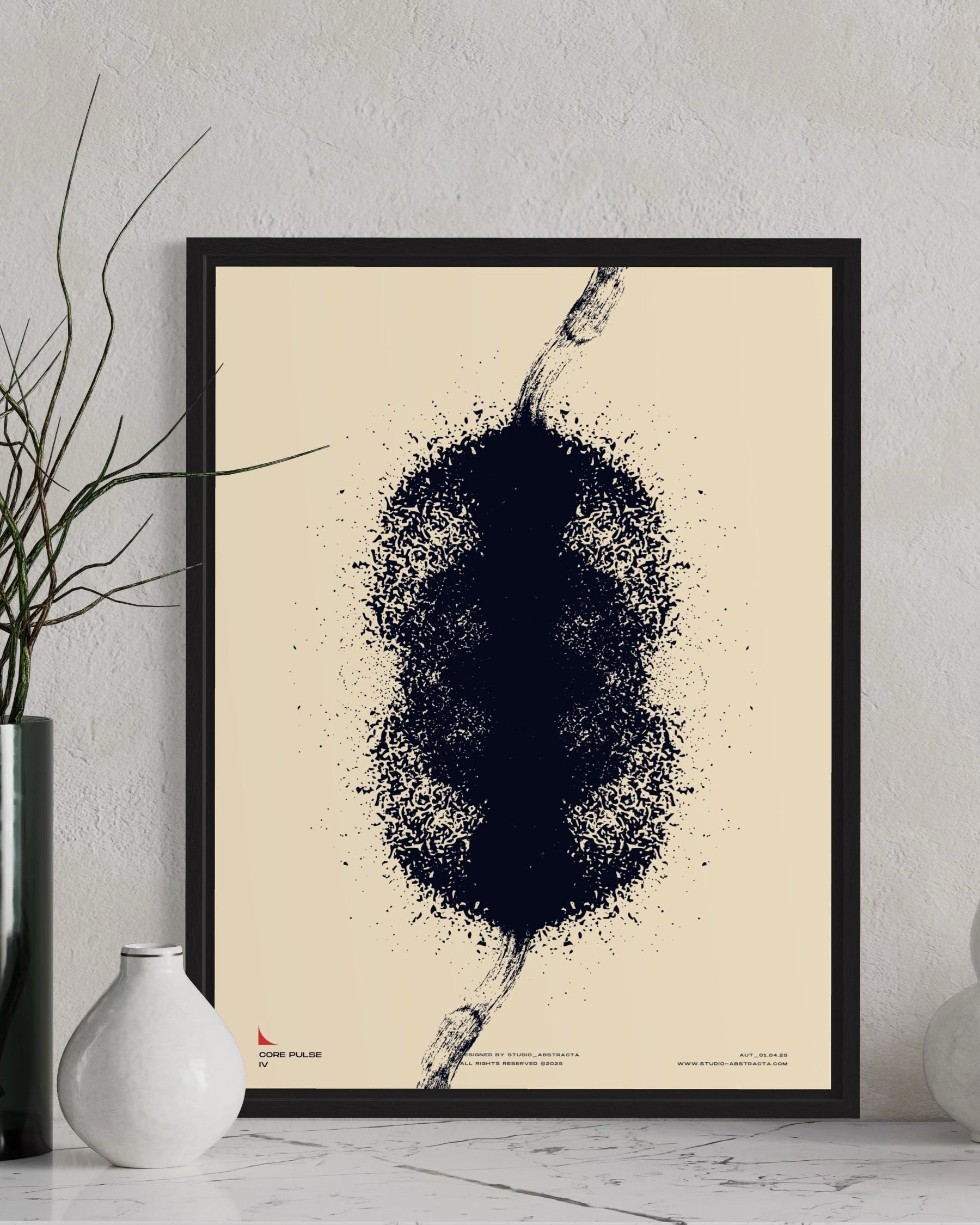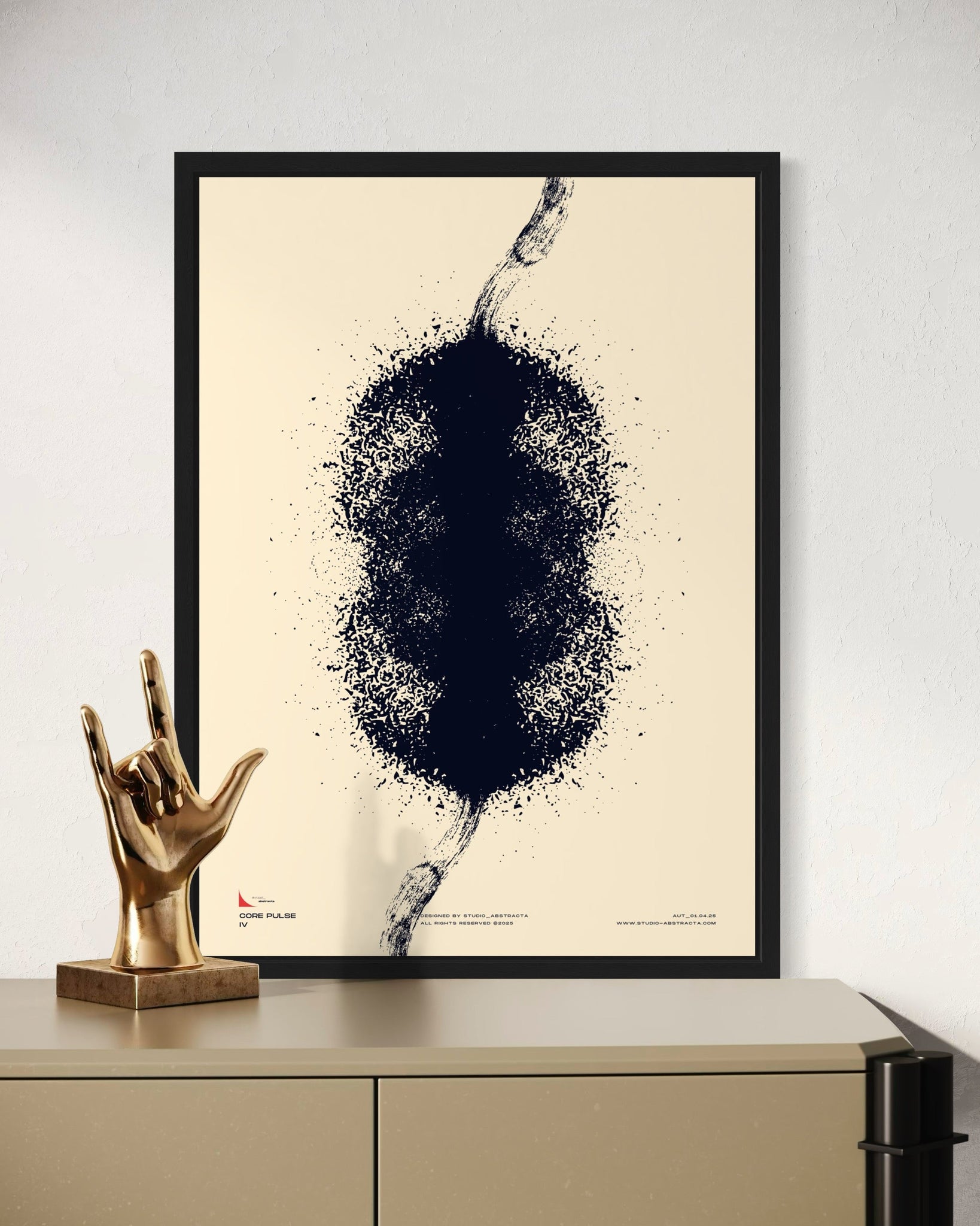 Core Pulse IV represents the inner pulse of life in its purest form. The dynamic dispersion of black particles evokes the deep, powerful currents that permeate the core of all existence. The strong contrast between the dark tone and the motion symbolizes the intense energy emanating from the center.
