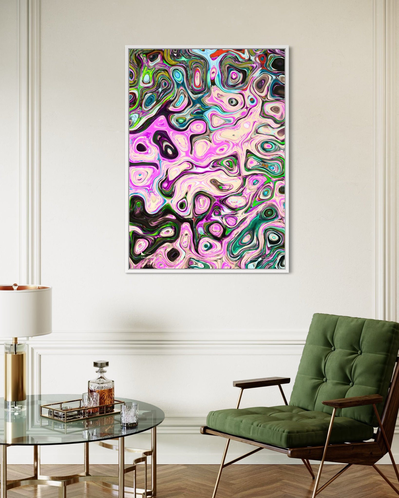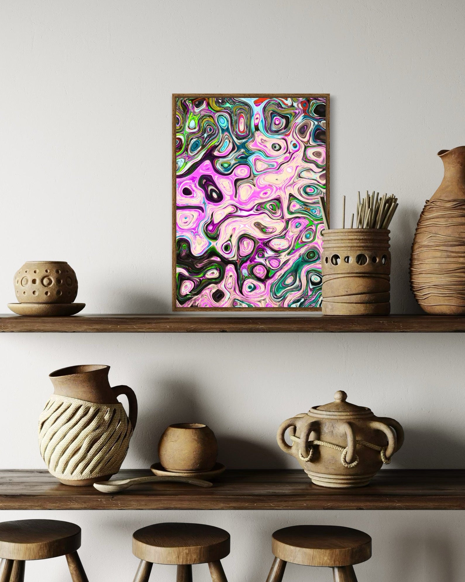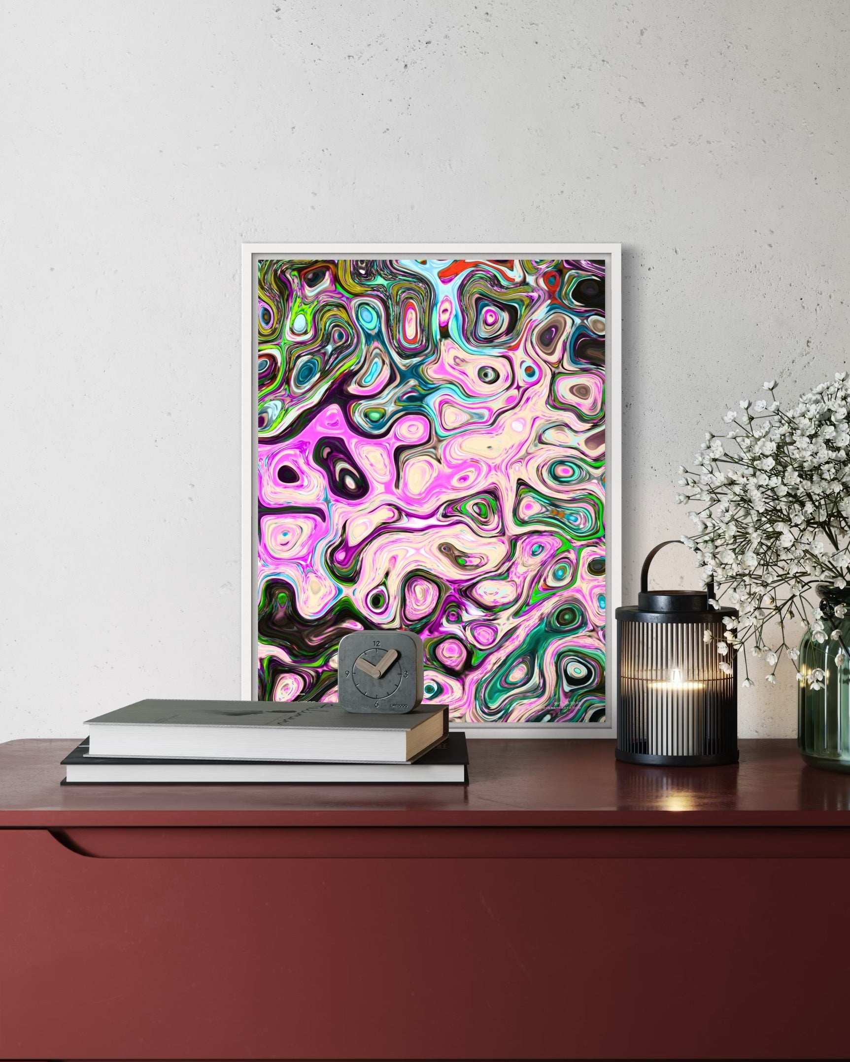 Unvermittelt zieht Liquiverse den Blick in ein lebendig vibrierendes Geflecht aus Strömungen und Wirbeln. Zellartige Inseln öffnen und verschließen sich wie Atemzüge, während verschlungene Bahnen einen spielerischen Kosmos aus Bewegung formen. Grenzen scheinen zu schmelzen, Perspektiven wechseln im Takt. Das Werk verkörpert freudige Offenheit und kreative Spannung – eine Einladung, im Strom der Eindrücke zu gleiten und Neues zu entdecken.