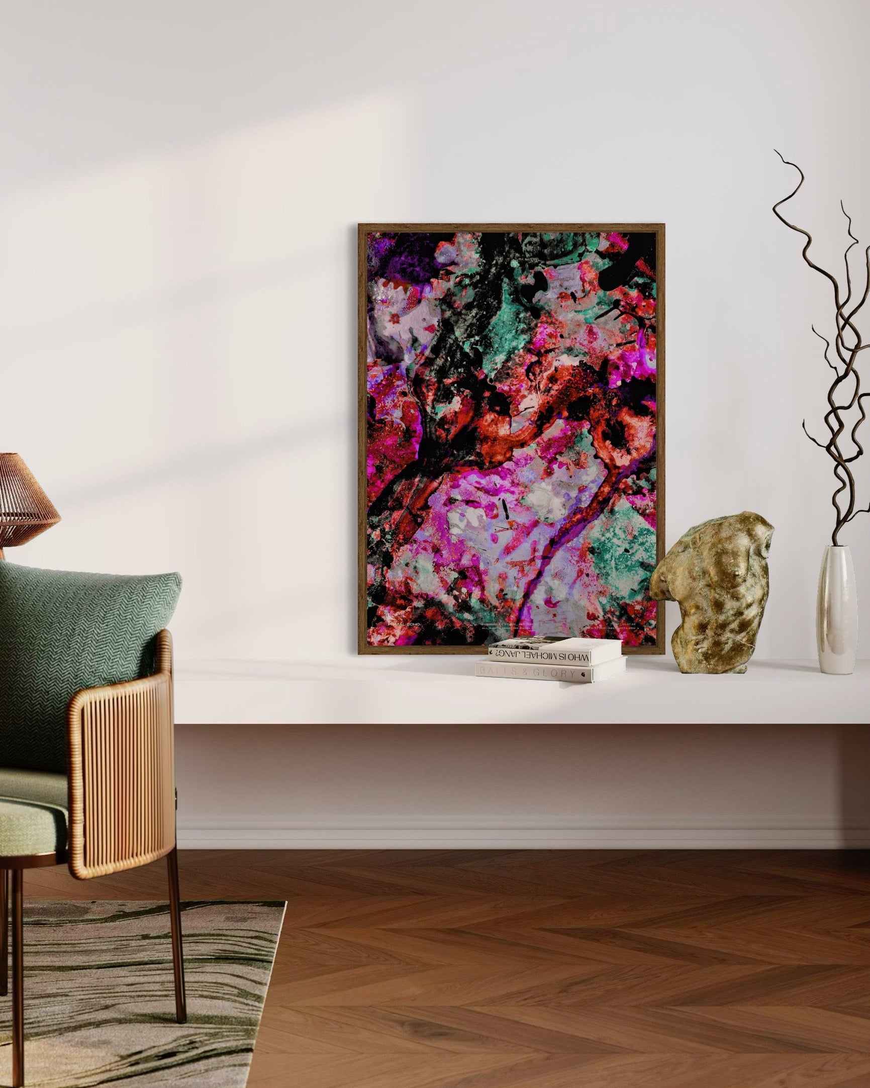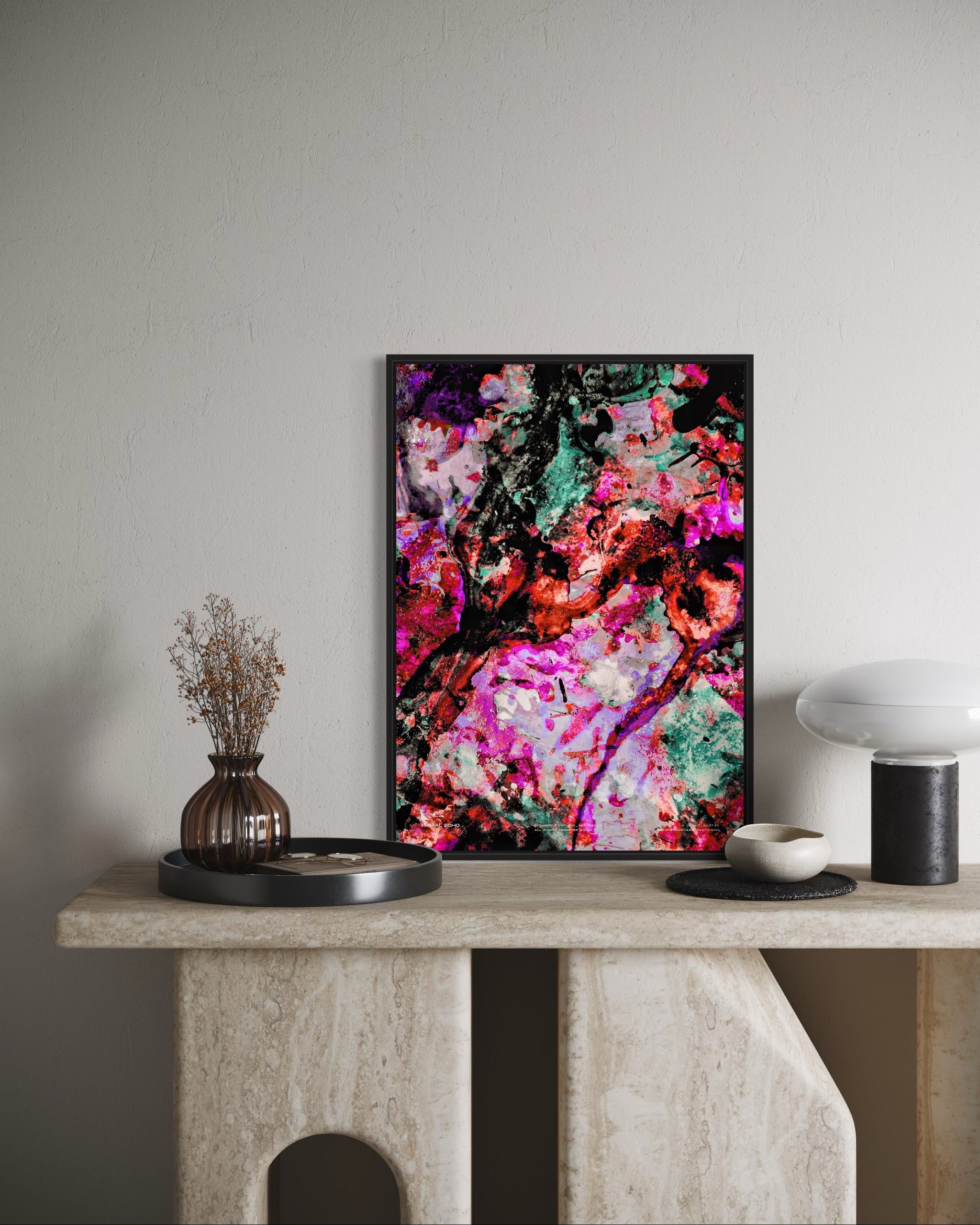 From the ground up, Primal Echo translates a raw murmur into momentum. Layers, fractures and speckled traces read like sediments of time, where memory fuses with present charge. Between erosion and renewal a living topology unfolds, guiding the eye across tectonic maps and inner terrains. The work concentrates primal forces into an incisive, lyrical resonance.