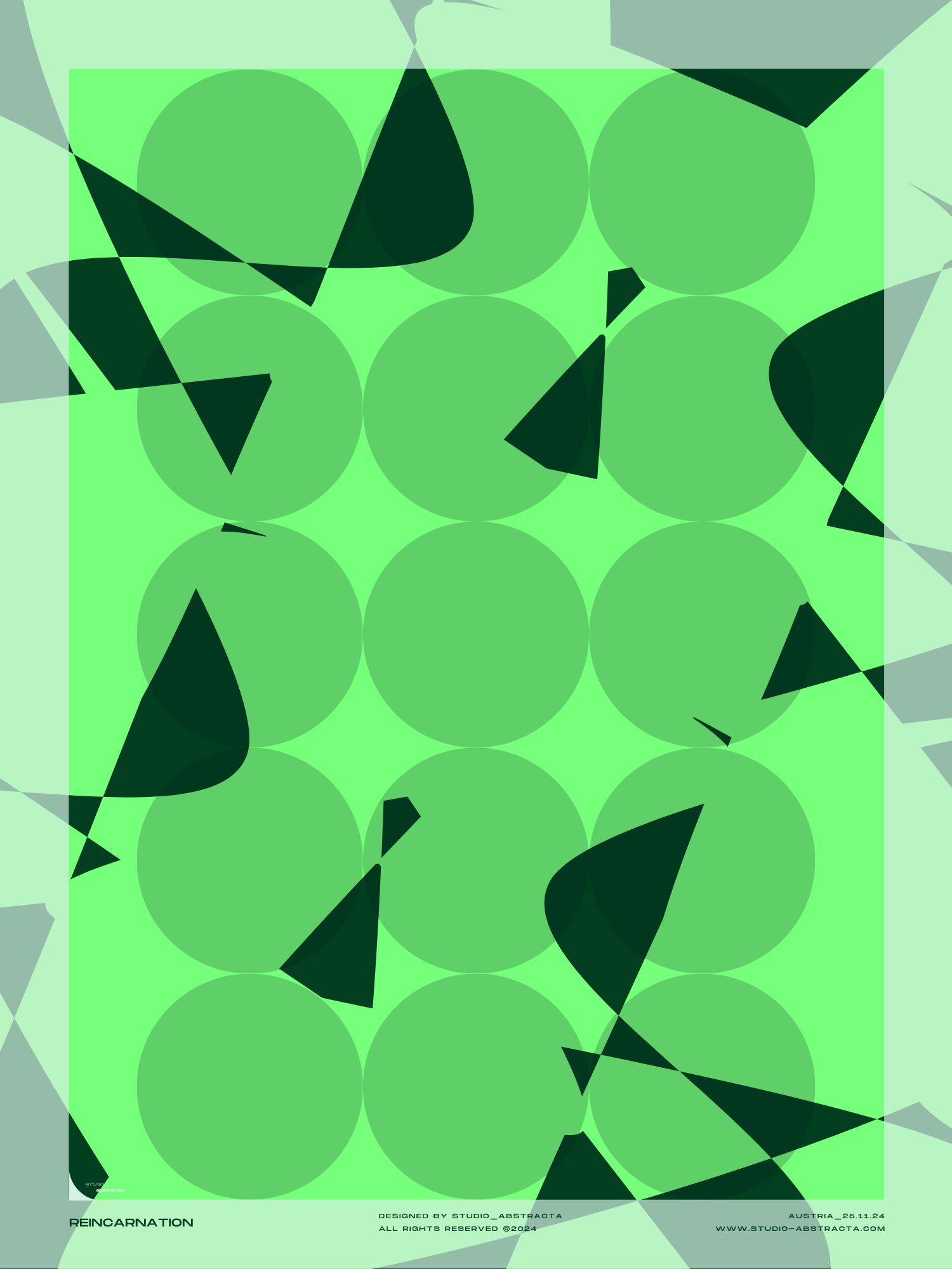 Reincarnation unfolds as a vibrant, energetic explosion of green tones, combined with bold, geometric shapes. The green hues, ranging from light to dark, symbolize strong vitality and cyclical change. The flowing, almost organic shapes contrast with sharp, angular elements, creating an atmosphere that feels both lively and dynamic. This composition evokes the eternal pursuit of renewal and transformation.