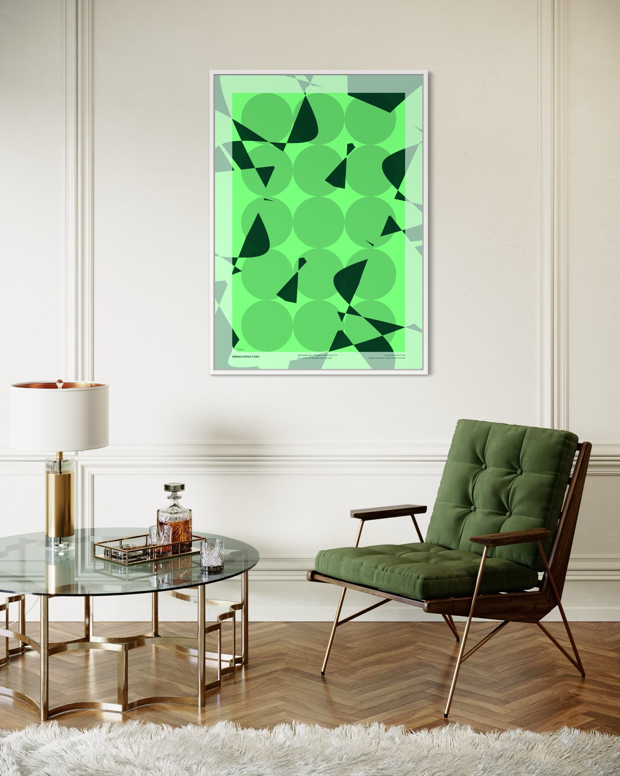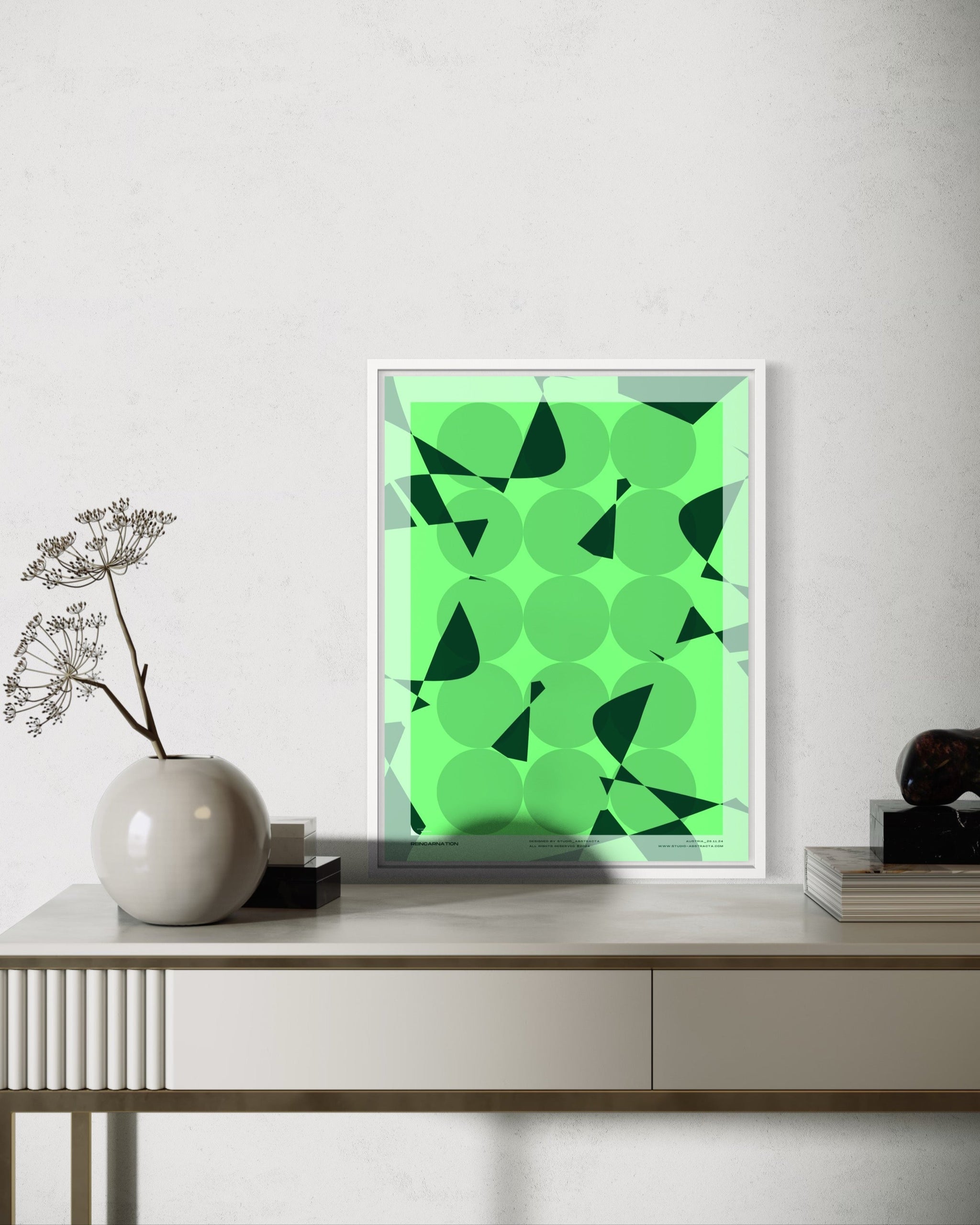 Reincarnation entfaltet sich als leuchtende, energetische Explosion von Grüntönen, die mit kräftigen, geometrischen Formen kombiniert werden. Die grünen Farbtöne, die von hellen bis zu dunklen Nuancen reichen, symbolisieren eine starke Vitalität und einen zyklischen Wandel. Die fließenden, fast organischen Formen kontrastieren mit scharfen, kantigen Elementen und erzeugen eine Atmosphäre, die sowohl lebendig als auch dynamisch wirkt. Diese Komposition erinnert an das ewige Streben nach Erneuerung und Transformation.