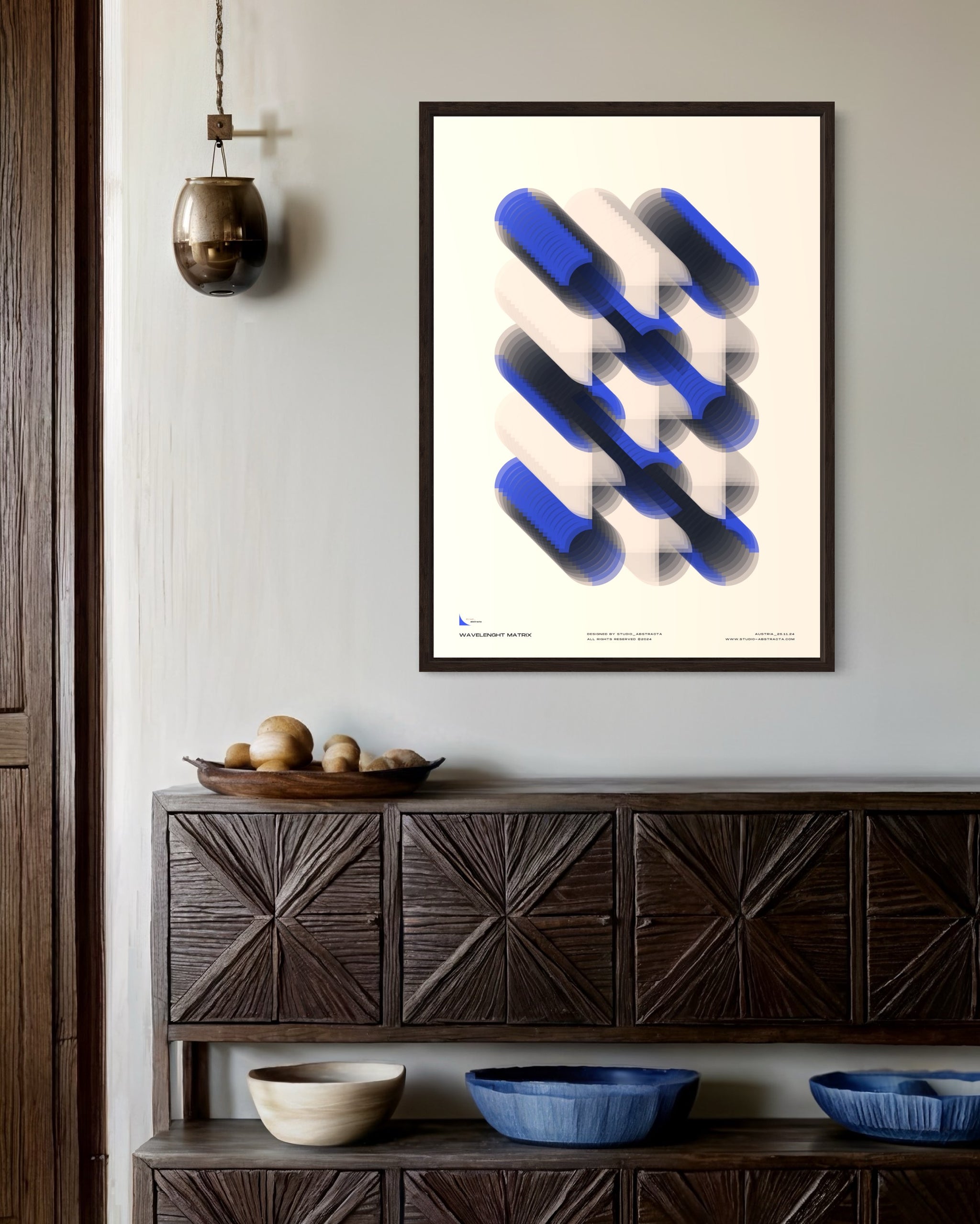 Wavelength Matrix plays with the dynamics of overlapping spiral shapes in vibrant blue and soft gray tones. The structures seem to be interconnected in a flowing motion, enhancing the idea of wave movement. The soft background accentuates the intense colors, creating a harmonious, almost meditative atmosphere.